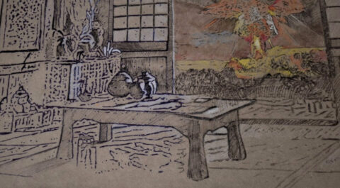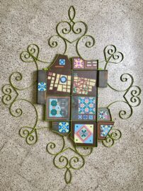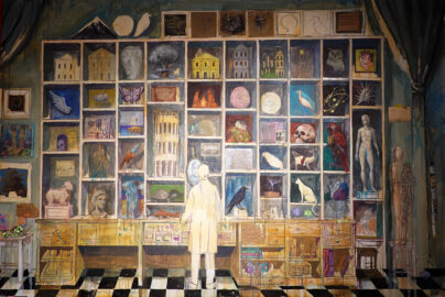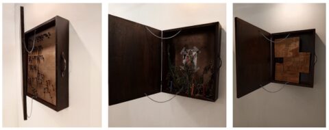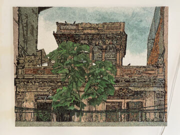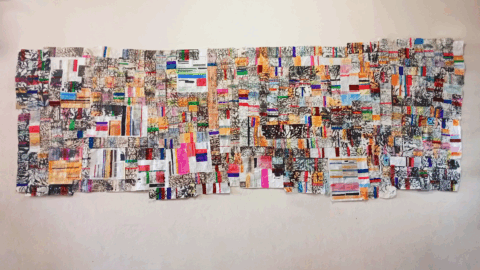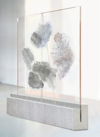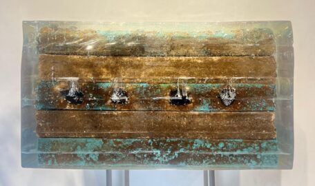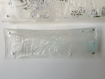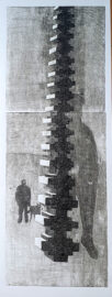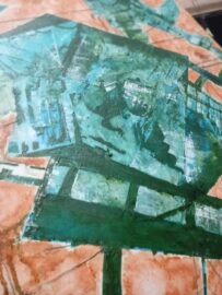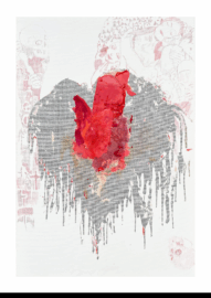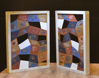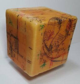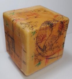 Dé collage - Lápiz de color, tinta, pegamento, pan de oro, papel Joss, resina epóxica.