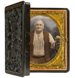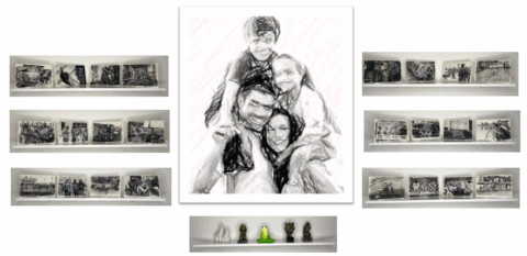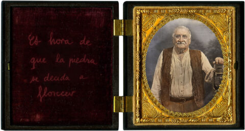 Por medio de una fotogrametría de mi padre creé su avatar digital controlado con I.A. Pude interactuar con él y hacerlo posar frente a un telón pintado para una fotografía al colodión húmedo, algo que le prometí en vida. Es un retrato post mortem, iluminado con óleo, donde sonríe como rara vez lo hacía. El colodión sobre vidrio se conoce como ambrotipo, cuyo significado es “impresión inmortal”. Como el mito, esta imagen actúa: no promete eternidad, pero encarna la memoria. El arte materializa la supervivencia simbólica, permitiendo que el padre perdido trascienda en forma y vínculo, más allá de la muerte.