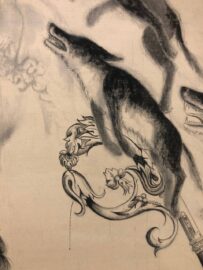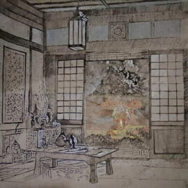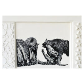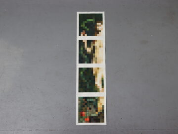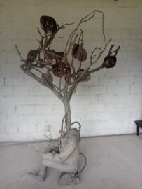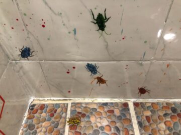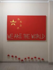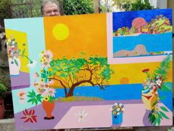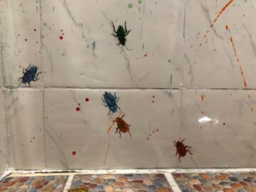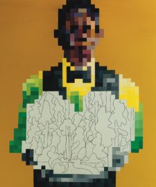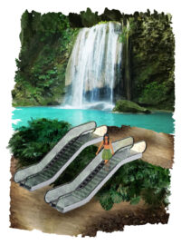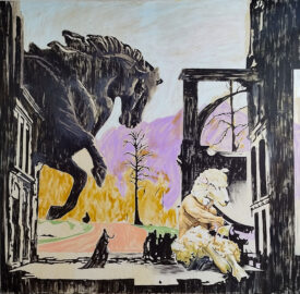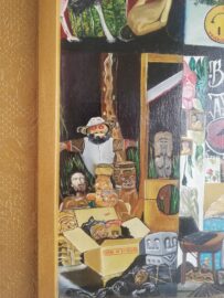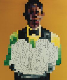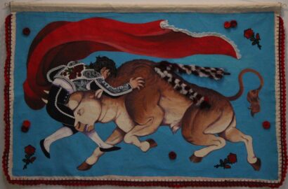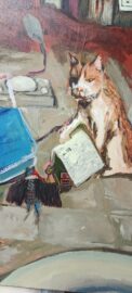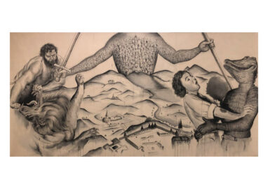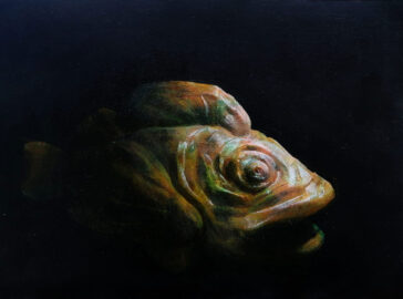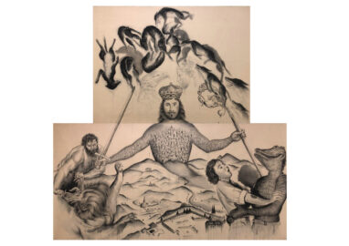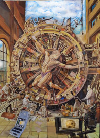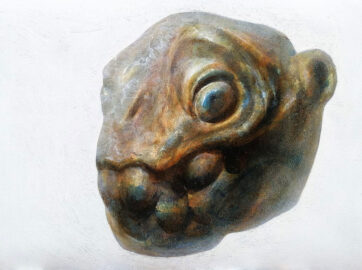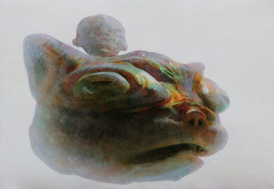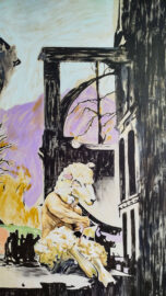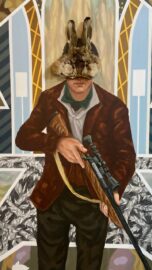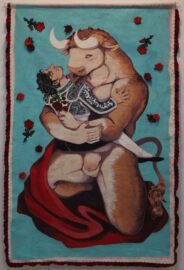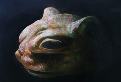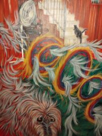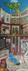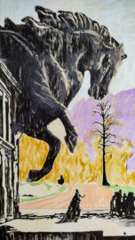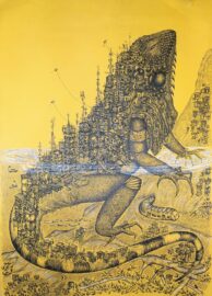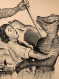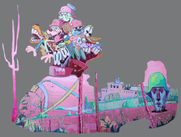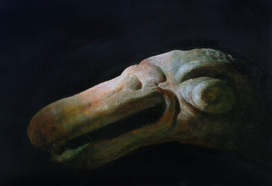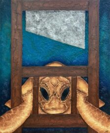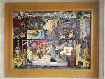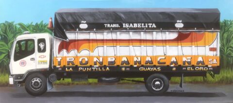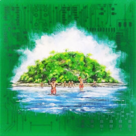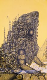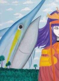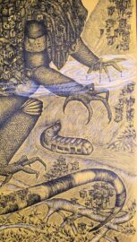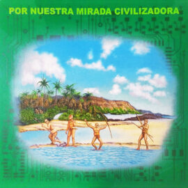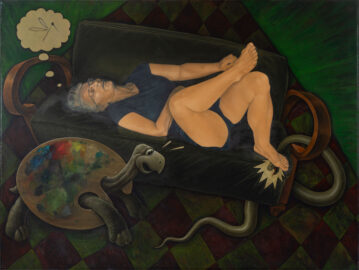 El título es “Mosquito”. En la escena aparecen varios elementos que han caracterizado mi trabajo a lo largo de los años; a saber, las referencias al cómic recurrentes en la obra de años recientes, el uso de los colores y la perspectiva distorsionada característicos de mi pintura de los años 90, el autorretrato en la figura de El Solitario George y por último el retrato de mi esposa Anabela que picada por un mosquito en su pie izquierdo y emulando a la virgen María con su otro pie aplasta la cabeza de la serpiente.