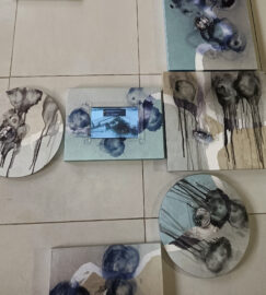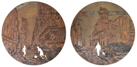 ¨Bocetos para paisajes DMA¨ es la continuación de una serie denominada ¨The world without us¨. Esta propuesta pictórica en la que el soporte metálico, usualmente rígido y frio, se convierte en un cuerpo vivo, vulnerable, que se oxida, se mancha y se descompone. La intervención con ácidos como herramienta para provocar la aparición de paisajes urbanos devastados es un gesto químico que sustituye el pigmento tradicional. La oxidación se convierte aquí en lenguaje pictórico, más que ilustrar, insinúa y contrasta entre el material y el bosquejo de dibujo que se crea a partir de las veladuras y aplicaciones de ácidos. El deterioro, la ruina y los personajes ausentes se manifiestan no como espectáculo, sino como atmosfera. La obra tensiona el recuerdo de lo frio y cotidiano con el temor (o la certeza) de una decadencia inevitable. La obra no ilustra una distopía futurista, sino que evidencia un presente que se descompone silenciosamente, una historia que se oxida frente a nuestros ojos. La técnica, el material y la forma circular remiten a ciclos que se repiten, advertencias que se ignoran, y al inevitable retorno de las consecuencias.