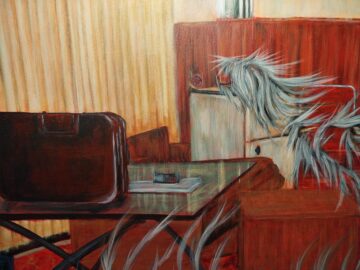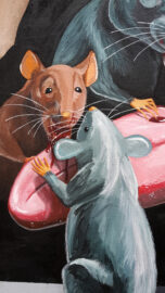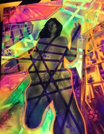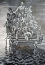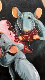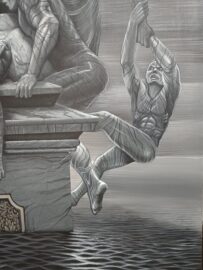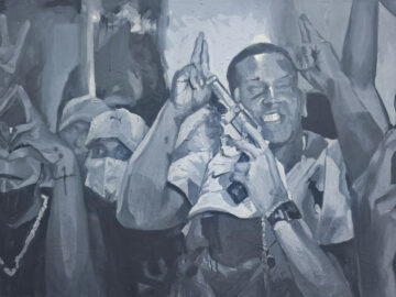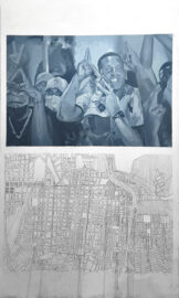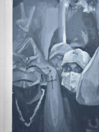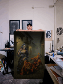 Esta obra expone las dislocaciones en las bases de los imaginarios colectivos, evidenciando cómo se distorsionan y manipulan las subjetividades y los deseos. Asimismo, interpela la glorificación de la violencia y el discurso elogioso que desvirtúa la percepción de esta era necropolítica, marcada por el uso de narco-estéticas cuyo glamour criminal eclipsa la tragedia humana. La obra se despliega a través de la pintura noir y la literatura pulp, confrontando dos imágenes que revelan los abismos en los roles asignados a cada grupo dentro de los imaginarios construidos desde la “oficialidad”.