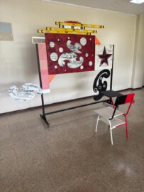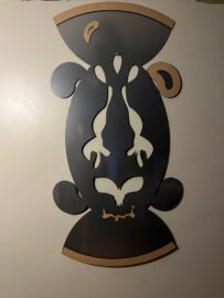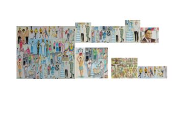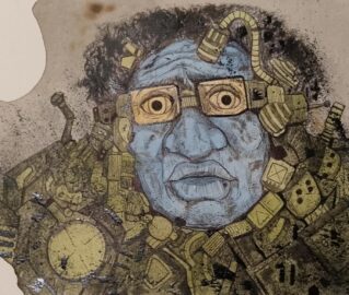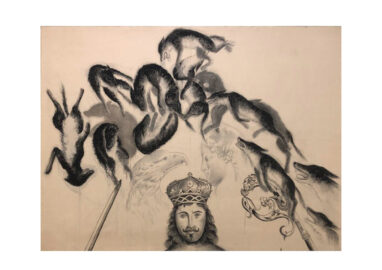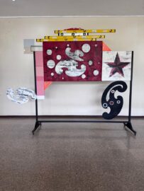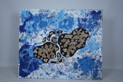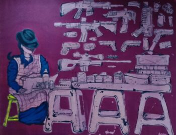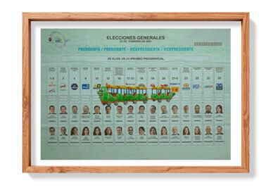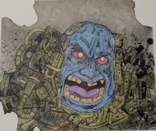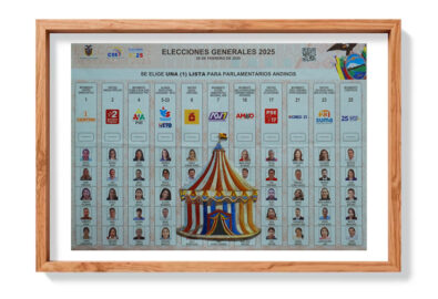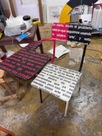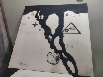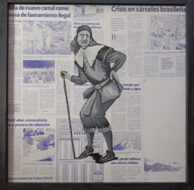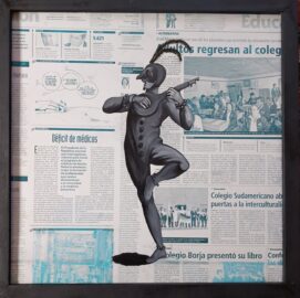 La obra parte de una investigación sobre el proceso de creación de la prensa escrita y cómo se maneja la información, eso me llevo al soporte que eran estas placas de aluminio que servían como una especie de sello de imprimación de las noticias los cuales luego eran desechados dejando esta especie de negativo impreso, el cual utilizo para representar mi arte, generando un acercamiento acerca de las prácticas de ejercer el poder y como puede ser mostrada o reflejada en circunstancias locales y latinoamericanas; por lo tanto lo represento con bufones que en su época servían para parodiar a personajes de altos mandos , así reflexionar sobre la noción de política desde el campo estético, es decir desde el régimen de pensamiento y de visibilidad del arte. A través de formas disruptivas y materiales innovadores, la pintura se convierte en un vehículo para cuestionar y transformar las percepciones, generando un diálogo dinámico entre la obra, el público y su contexto contemporáneo
