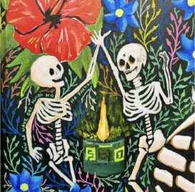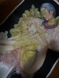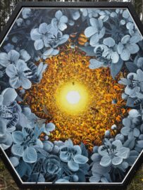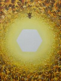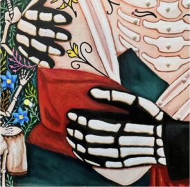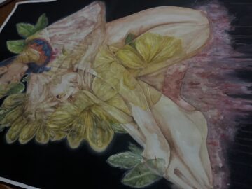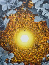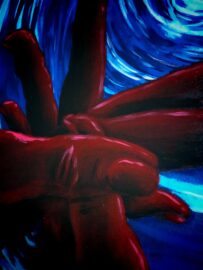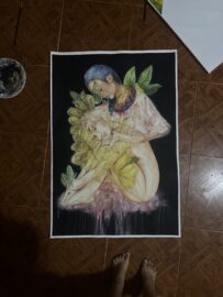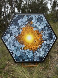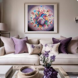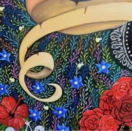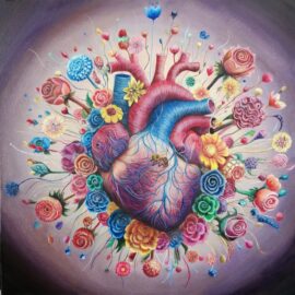 Latidos de flor se enmarca en una práctica artística que entrelaza la biología con la experiencia emocional, explorando los límites entre lo corporal y lo simbólico. La obra nace desde una vivencia concreta: la ansiedad como fenómeno fisiológico y psicológico. Lejos de reducirla a un síntoma clínico, aquí se convierte en materia estética, en narrativa pictórica, en impulso vital. Desde una aproximación introspectiva, la artista convierte el corazón en eje narrativo, no solo como órgano, sino como símbolo palpitante de la fragilidad humana. Los colores intensos y las formas orgánicas que lo componen están lejos del realismo anatómico; responden más bien a una cartografía emocional, donde lo físico se funde con lo espiritual. La textura espiralada evoca los caminos circulares del pensamiento ansioso, mientras que los escurrimientos aluden a una energía que no se contiene, que fluye, que desborda. En ese caos cromático aparece un contrapunto delicado: la flor. Como metáfora del equilibrio que surge después de la lucha interna, la flor es calma sin pasividad, fuerza sin violencia. Este contraste entre el frenesí interno del corazón y la serena existencia de la flor expresa una verdad profundamente humana: de las tensiones vitales pueden brotar actos de belleza, comprensión y sanación. La obra dialoga con discursos contemporáneos sobre la salud mental, el cuerpo como archivo emocional, y el arte como vía de catarsis. Al unir la estética con lo neuroemocional, Latidos de flor propone una nueva forma de ver la ansiedad: no como patología que debe suprimirse, sino como energía que puede transformarse en creación.