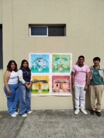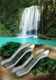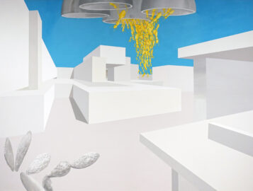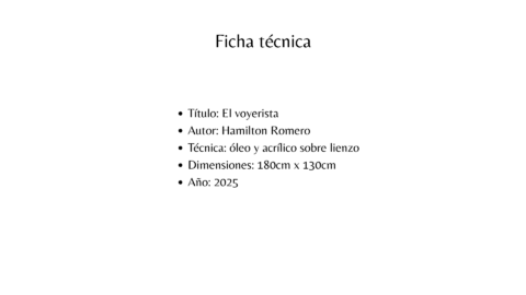 Marco teórico – “Novedad” Carlos Echeverría Kossak Novedad es una reflexión visual sobre los impactos de la tecnología, la exploración espacial y el papel del ser humano en relación a su entorno. La pintura representa un paisaje arquitectónico abstracto, limpio y estéril, que podría pertenecer tanto a una colonia espacial como a una maqueta digital. El único rastro de naturaleza es un cactus en tonos grises que sugiere una escasez de recursos y plantea interrogantes sobre la viabilidad de la vida en este entorno. En el centro de la composición, un grupo de hormigas amarillas emerge desde estructuras que remiten a cápsulas espaciales o cohetes. Las hormigas funcionan como símbolo de colectividad, desplazamiento y adaptación. Pueden representar tanto a los humanos explorando nuevos mundos como a entidades ajenas, en un posible futuro de colonización planetaria. La falta de gravedad y la iluminación artificial refuerzan la sensación de irrealidad, abriendo la posibilidad de que este mundo no sea físico sino mental, conceptual o incluso una simulación. La obra dialoga con temas actuales como la expansión tecnológica, la automatización, la IA, y la desconexión progresiva con el entorno natural. Es también una reflexión sobre cómo imaginamos el futuro y sobre quiénes lo habitarán.