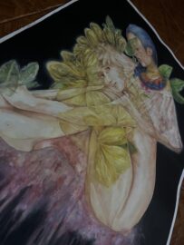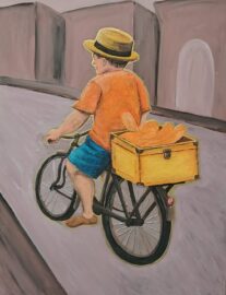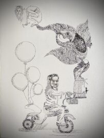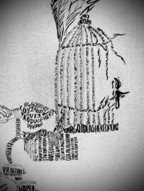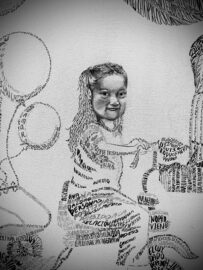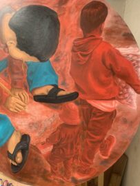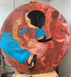 La obra Inocencia se fundamenta en una exploración simbólica y emocional de la crianza infantil, los traumas no resueltos y el proceso de sanación interna. Esta pintura toma como punto de partida las reflexiones del libro Cómo cuidar a tu niño interior de Jordi Gil Martín, y se articula a través de elementos visuales y caligramas que construyen un lenguaje introspectivo sobre la experiencia emocional en la niñez y su repercusión en la adultez. Desde una perspectiva psicológica, el concepto de niño interior alude a esa parte emocional, sensible y vulnerable que todos llevamos dentro. Cuidarlo implica reconocer heridas tempranas, brindar contención a experiencias traumáticas y permitir el desarrollo de la resiliencia. En la pintura, esta idea se materializa en la figura de una niña en triciclo, símbolo de la infancia, rodeada de caligramas que representan miedos personales, la indecisión ante el porvenir y las cárceles emocionales autoimpuestas. Estudios como el de la Universidad Politécnica Salesiana (2021) evidencian cómo el maltrato infantil deja huellas psíquicas que persisten en la adultez, manifestándose incluso como Trastorno de Estrés Postraumático (TEPT). Este impacto se hace visible en la obra mediante la figura adulta de la niña que empuña un martillo, metáfora del pensamiento repetitivo y de la repetición inconsciente del dolor. El cuerpo, planteado como "nuestro hogar", se convierte en el contenedor de esas memorias emocionales, mientras que el pez que lame sus heridas —autoretrato de la artista— funciona como símbolo de autocuidado y sanación emocional. Los globos que se elevan desde el triciclo evocan la inocencia como una fuerza persistente, frágil pero capaz de alzarse frente al trauma. La obra plantea que la infancia no es solo una etapa cronológica, sino un campo de energía emocional y espiritual que marca profundamente el desarrollo del ser. Así, el arte se transforma en un puente para visibilizar, comprender y resignificar las vivencias que constituyen la memoria emocional y corporal.