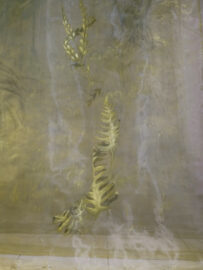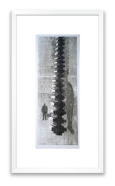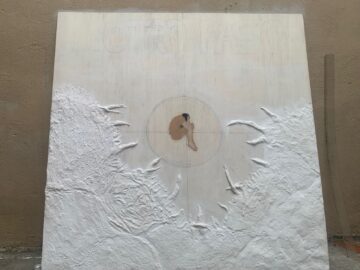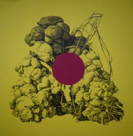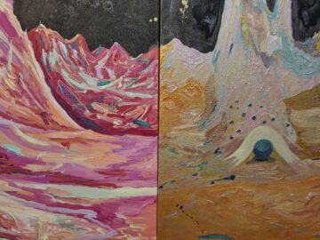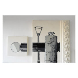 La escala humana en relación al cosmos, es una idea que intento abordar en algunos de mis trabajos. En “Horizonte sideris”, represento pictóricamente dos imágenes: una microscópica, pero amplificada de una corteza cerebral, y otra de las misiones Apollo a la luna. De esta manera busco asociar tanto lo interno como lo externo. Me interesa resignificar objetos cotidianos, imágenes o archivos existentes, que son parte de nuestra memoria, a través del desplazamiento de imaginarios teológicos, conceptos científicos o culturales que dan forma a la subjetividad moderna. El título hace referencia al tratado astronómico: Sidereus nuncius, publicado en 1610, donde Galileo Galilei, basado en las observaciones a través de su telescopio, desafiaba las concepciones del universo, hasta ese momento.