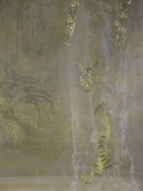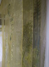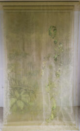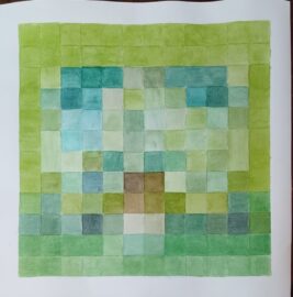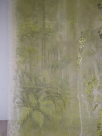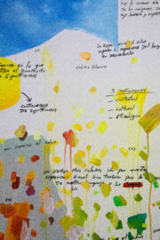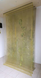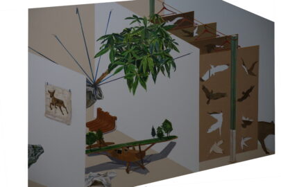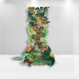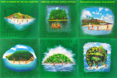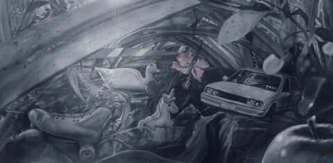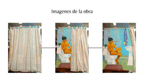 En la obra podemos observar objetos sumergidos en una vegetación, sin proporciones reales, pintada en tonalidades grises-grisalla. La pintura fue desarrollada con acrílico mezclado con carbonato de calcio y resina para que la superficie seque áspera para intervenirla con óleo pastel, el color será añadido por los espectadores mediante textos o dibujos, haciendo visible su participación con la guía del artista, como metáfora de que todo es percepción: el color, la forma en que nos manipulan e intervenimos nuestro entorno. Es una critica de cómo percibimos la realidad, como controlan las masas multiplicando narrativas, reafirmando sesgos creando homogeneidad de pensamiento.