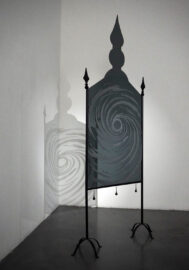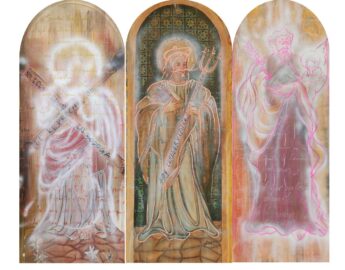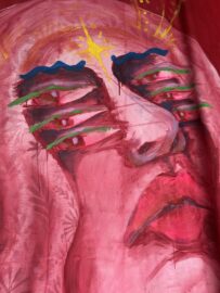 Luz que proyecta sombra sobre nuestros ojos se despliega como una escena suspendida, donde las figuras no habitan un tiempo lineal, sino una dimensión intermedia, compuesta por una estructura modular de tubos de acero, cuerpos alados, rostros flotantes, canales energéticos y gestos simbólicos que se entrelazan en una visión del imaginario espiritual. Aquí, el fuego no destruye: revela. Las alas no elevan: abren. La figura central no domina: observa. La pintura se ofrece como un cuerpo sin perspectiva, una iconografía suspendida que remite más a los lenguajes del códice, del tapiz o del fresco medieval, donde cada elemento posee un peso ritual más que espacial. Las figuras —fragmentadas, aladas, silentes— habitan un tiempo propio, sin gravedad, en constante tránsito entre lo humano y lo sagrado. La ausencia de profundidad se convierte así en una forma de condensación: todo ocurre aquí, todo está a la vista, nada se oculta en la distancia. La pintura se lee como se invoca: capa por capa, símbolo por símbolo. Esta obra no se explica: se percibe como un umbral. Es una invocación visual, una experiencia en sí misma, una escena de tránsito donde la energía se pliega, se dispersa y, finalmente, se transforma.