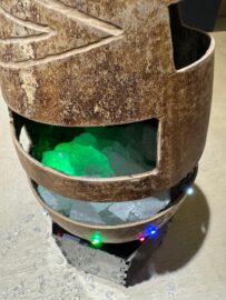 Me reconozco como una falsa científica no desde la negación, sino desde la desviación metodológica. Uso el lenguaje, los tiempos y la estructura de la ciencia para derivar hacia hipótesis no verificables, para construir dispositivos rituales que se inscriben en la estética especulativa. En lugar de evidencias, propongo presencias. En lugar de resultados, transiciones. Mi pensamiento se nutre de la cosmotécnica de Yuk Hui, quien entiende la técnica no como instrumento sino como articulación de sentido dentro de un mundo situado. Me sitúo desde ahí, en un cruce donde la tecnología no es externa a lo espiritual, sino su aliada táctil y simbólica. Trabajo con dispositivos que no miden ni conectan, sino que median entre lo que se recuerda y lo que no tiene nombre. El concepto de tecnochamanismo, en diálogo con Fabiane Borges, me permite comprender mi práctica como una mediación entre materialidades locales, memorias epigenéticas, tecnologías de acceso sensorial y pensamiento simbólico. El cuerpo que interviene en esta obra no es el cuerpo socializado moderno, sino uno que transita lo dionisíaco, lo ctónico, lo alquímico, lo intuitivo. Las figuras de la ninfa, la bruja, el médium y la diosa preclásica (como Diana) me permiten imaginar otros modos de saber: no racionales, no lineales, no patriarcales. Me interesan los saberes que se encarnan en las sombras, que aparecen en el trance, que son ilegibles en el código binario pero operan con fuerza simbólica y afectiva. Esta obra no busca ilustrar estos conceptos, sino que los invoca desde su materialidad y disposición. Aquí también se inscribe mi lectura del Manifiesto Cyborg de Donna Haraway, donde el cuerpo y la máquina ya no se excluyen mutuamente, sino que se entrelazan como una condición mestiza, expandida, poshumana. El médium que construyo no es un retorno al origen puro, sino una prótesis sensible que habita el presente en contacto con lo ancestral y lo artificial al mismo tiempo. Es un aparato para la aparición, una estación de tránsito. No garantizo que algo ocurra. Pero me preparo para que lo improbable encuentre lugar.